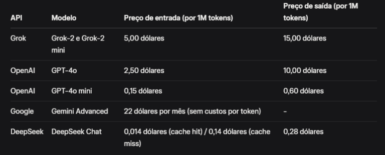 Grok apresenta o custo mais elevado por tokens de saída, o que pode torná-lo pouco atrativo em projetos com grande volume de geração de texto, como plataformas de conteúdo automatizado.